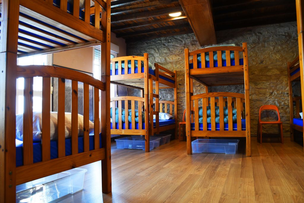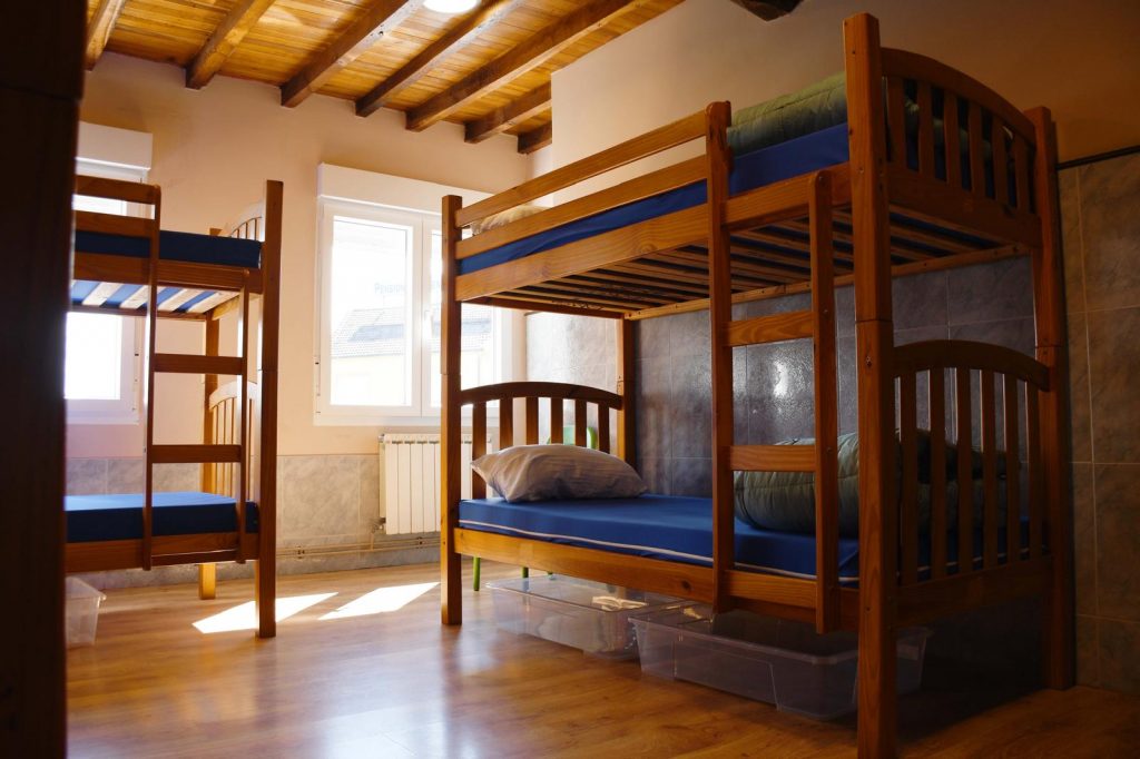 Tras una larga etapa, te esperan cómodas y espaciosas literas de madera en habitaciones compartidas de poca capacidad, con luz y ventilación natural gracias a sus múltiples ventanas al exterior.